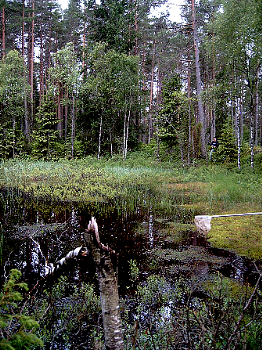 und Gewöhnlicher Fichte. Im Unterholz wachsen Gagelstrauch und Sumpf- Porst.