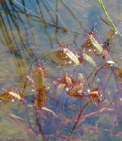 während der Mittlere Sonnentau trockenere Orte bevorzugt, die aber trotzdem noch feucht bis nass sein müssen. Aufgrund der extremen Nährstoffarmut seiner Umwelt, holt er sich zusätzliche Kohlenhydrate durch die Verdauung von Kleinstinsekten Neben dem Sonnentau sind auf dem unteren Bild noch die Schößlinge des Gagelstrauchs zu sehen. |